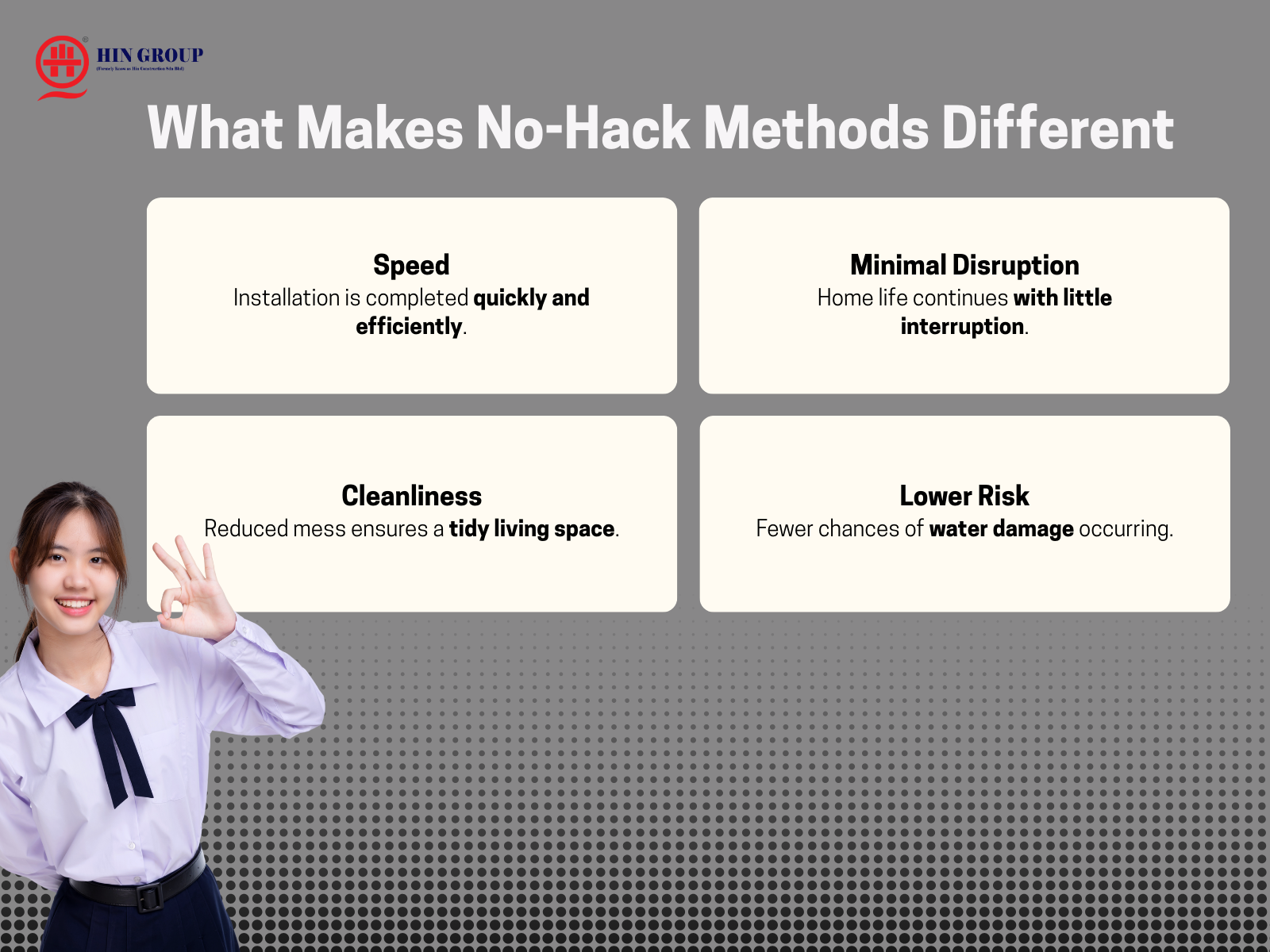 “Saya memang stress bila tengok bilik air bocor setiap bulan. Lepas guna servis Hin Group, masalah terus selesai. Proses cepat, tak perlu pecahkan jubin pun!” – Aina, Putrajaya