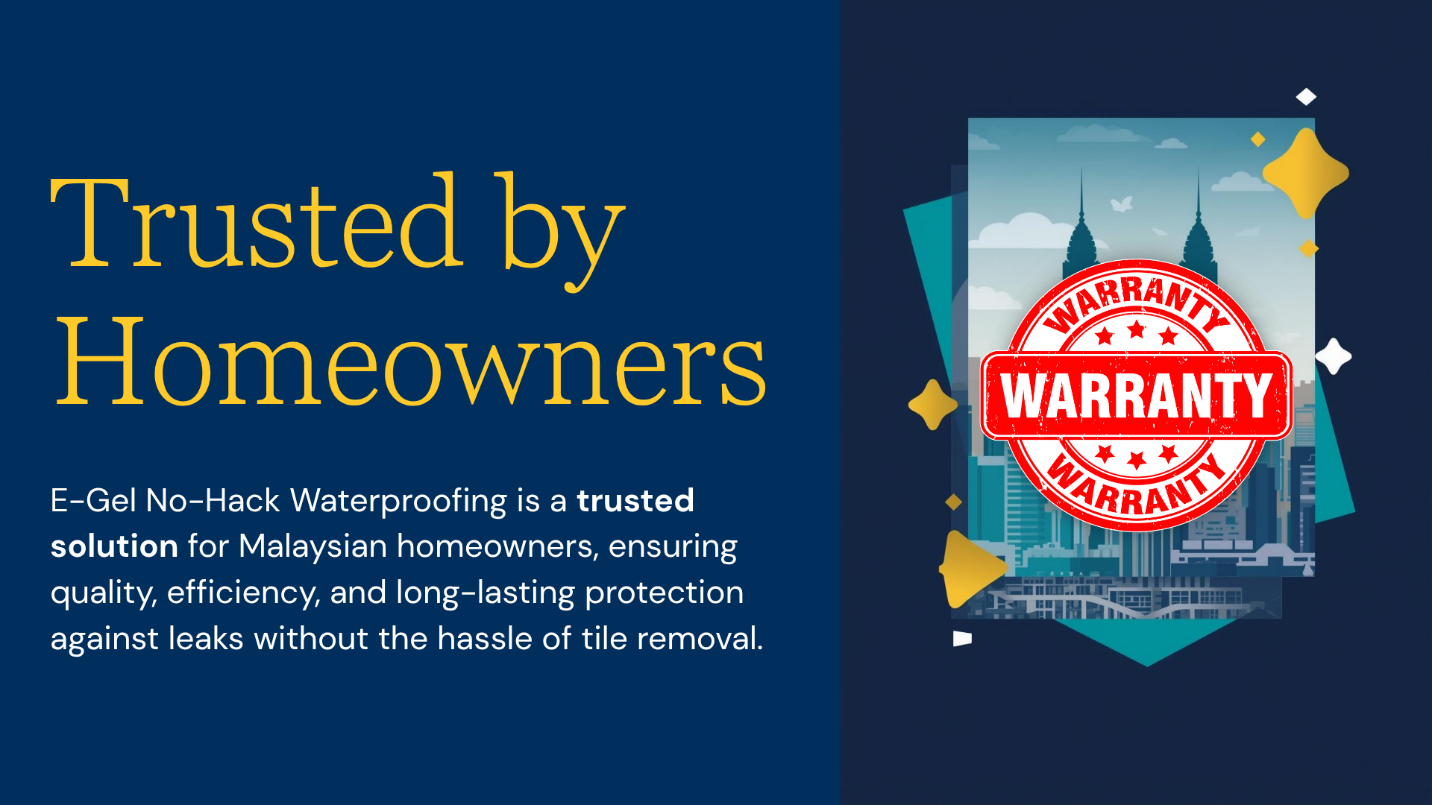 "Bilik air kondo saya terus bocor ke unit di bawah. Hin Group datang, melakukan suntikan E-Gel dalam masa 3 jam — masalah selesai! Tiada penggodaman, tiada bau, tiada sakit kepala. Sangat mengesyorkan." - Nur Ain | Sri Petaling"Juruteknik mereka menerangkan segala-galanya dengan jelas malah memberikan kad jaminan selepas kerja. Perkhidmatan profesional dan pantas!"— En. Tan | Damansara Utama