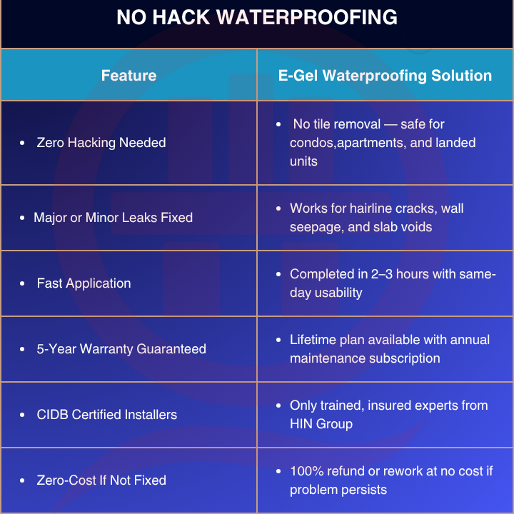 正在为八打灵再也、吉隆坡、万宜、蕉赖或莎阿南的浴室漏水问题而苦恼?我们提供高端零开裂防水解决方案,并提供 5 年质保— —无需开裂瓷砖、不造成任何杂乱、无需停机。我们专有的 E-Gel 系统可快速堵住所有轻微和严重的漏水。