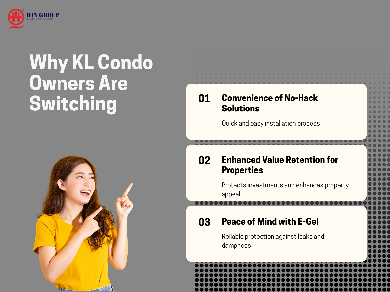 At Hin Group, we understand how critical proper bathroom waterproofing is. Whether you prefer the traditional hacking method (removing tiles and redoing waterproofing) or a no-hack solution like E-Gel, we provide a clear, transparent comparison so you can choose the right solution with confidence.